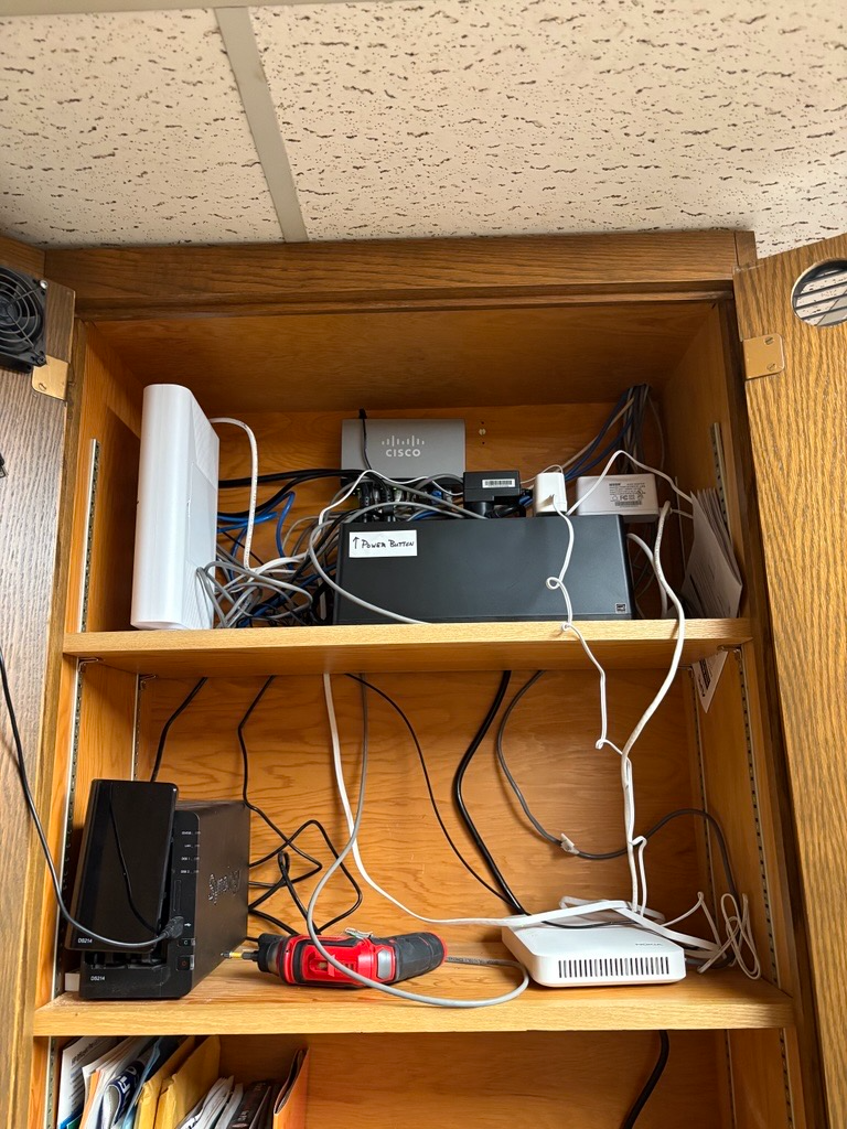 They also have 2 Ethernet runs to two different parts of the building, one goes into the west area of the building in the main sermon hall - we have a U4 placed here. The other wired U4 is down the hallway in an office of someone named Connie. They don't have another Ethernet run for the 3rd U4 but it is wirelessly paired and they wanted it to help cover the very end of the hallway as that is where the signal is weakest.